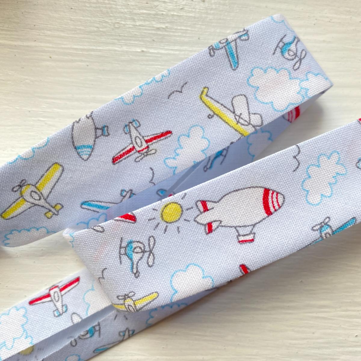 Biais replié de 2 cm de large, vendu au mètre. Il représente des avions en rouge et bleu. Parfait pour border un ouvrage pour enfant, une sortie de bain, un bavoir, un carnet de santé ...