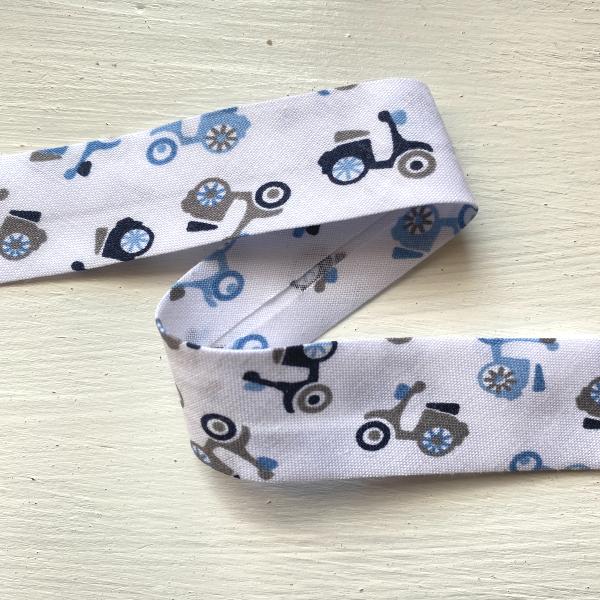 Biais replié de 2 cm de large. Il représente des scooters dans des teintes de bleu, gris, gris foncé ... Parfait pour border une sortie de bain, un bavoir, un carnet de santé ou tout autre ouvrage pour enfant. Vendu au mètre.
