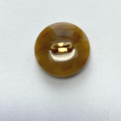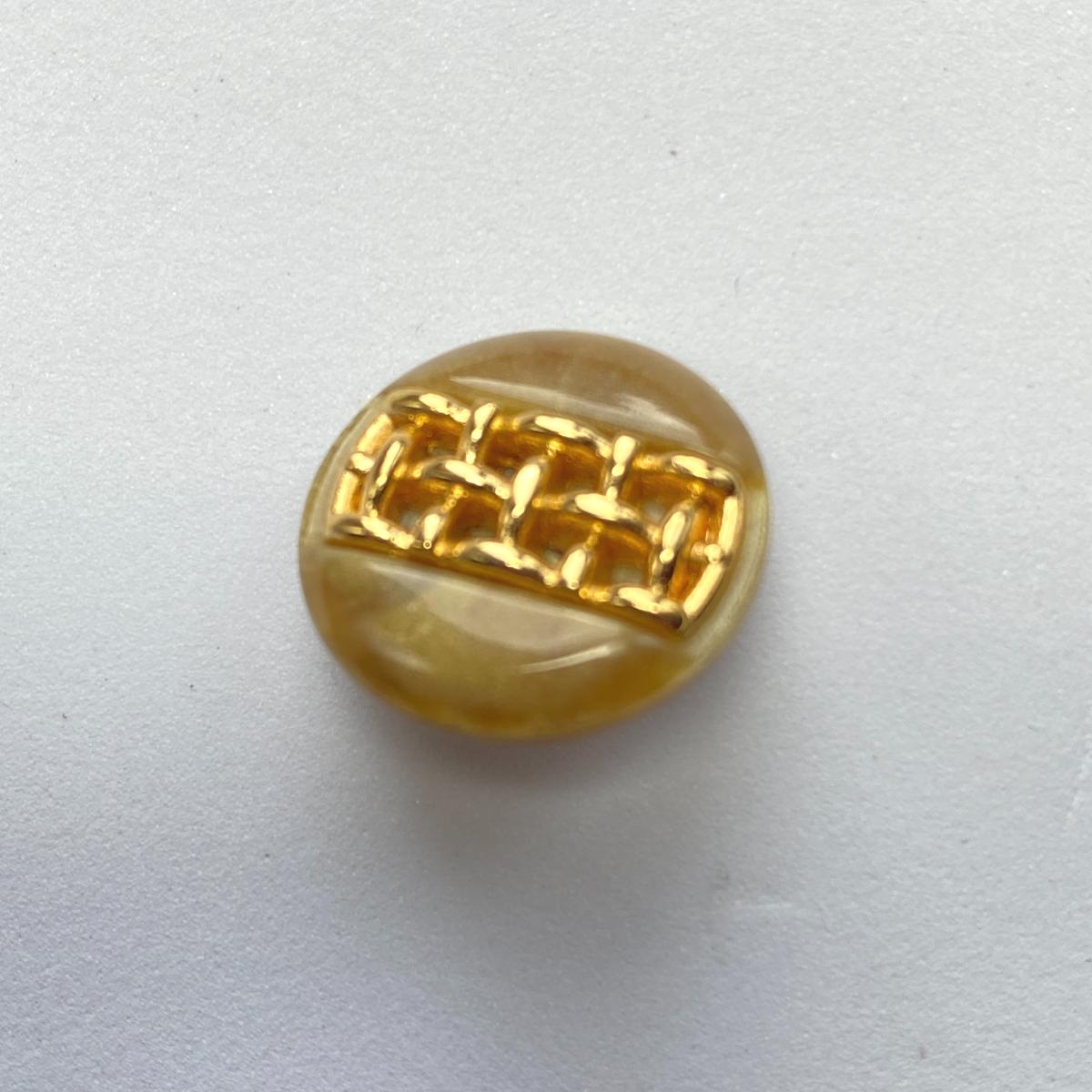 Bouton acrylique à pied de 15 mm de diamètre, sophistiqué. Il a en son centre une sorte de tresse couleur or.
