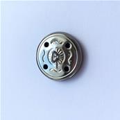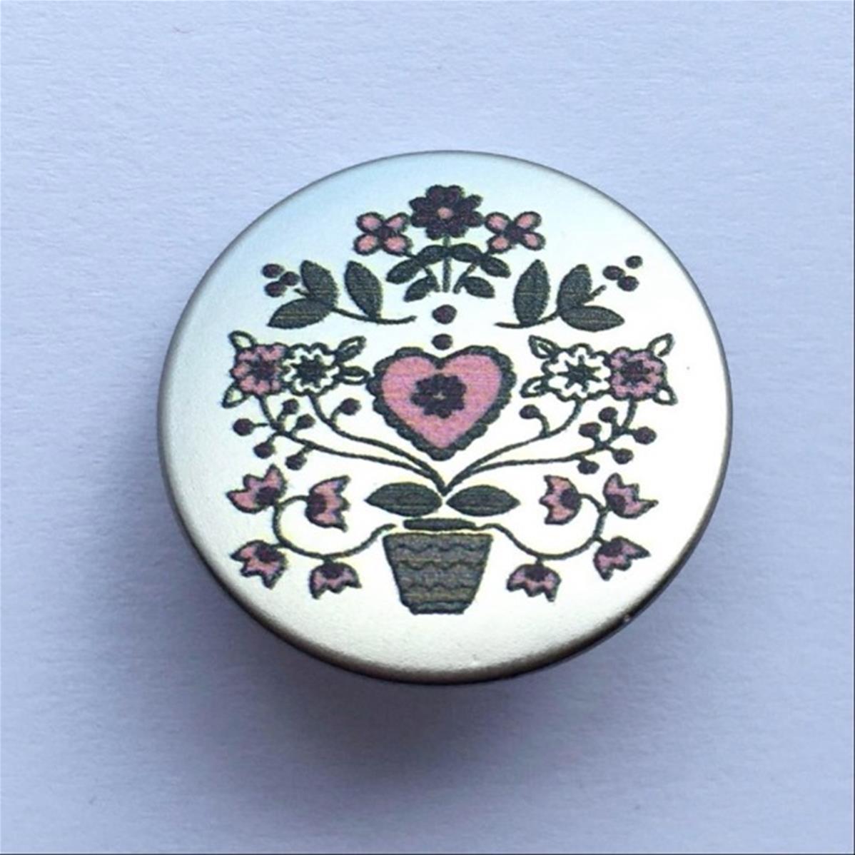 Bouton métallique à pied de 20 mm de diamètre. Couleur acier, fleurs et coeur en rose et vert. Il fermera avec beaucoup d'élégance un cardigan, un gilet ...