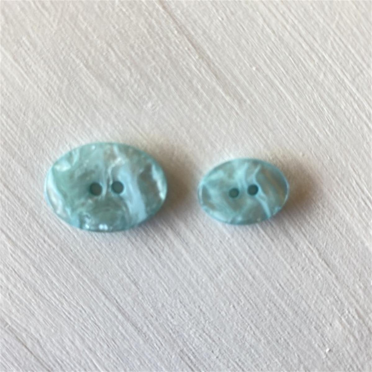 Bouton acrylique ovale avec deux trous, déclinés en deux tailles, 15 et 20 mm, et en plusieurs couleurs. Il est intéressant car légèrement incurvé sur le dessus, ce qui lui donne des reflets et le fait moins "classique".
