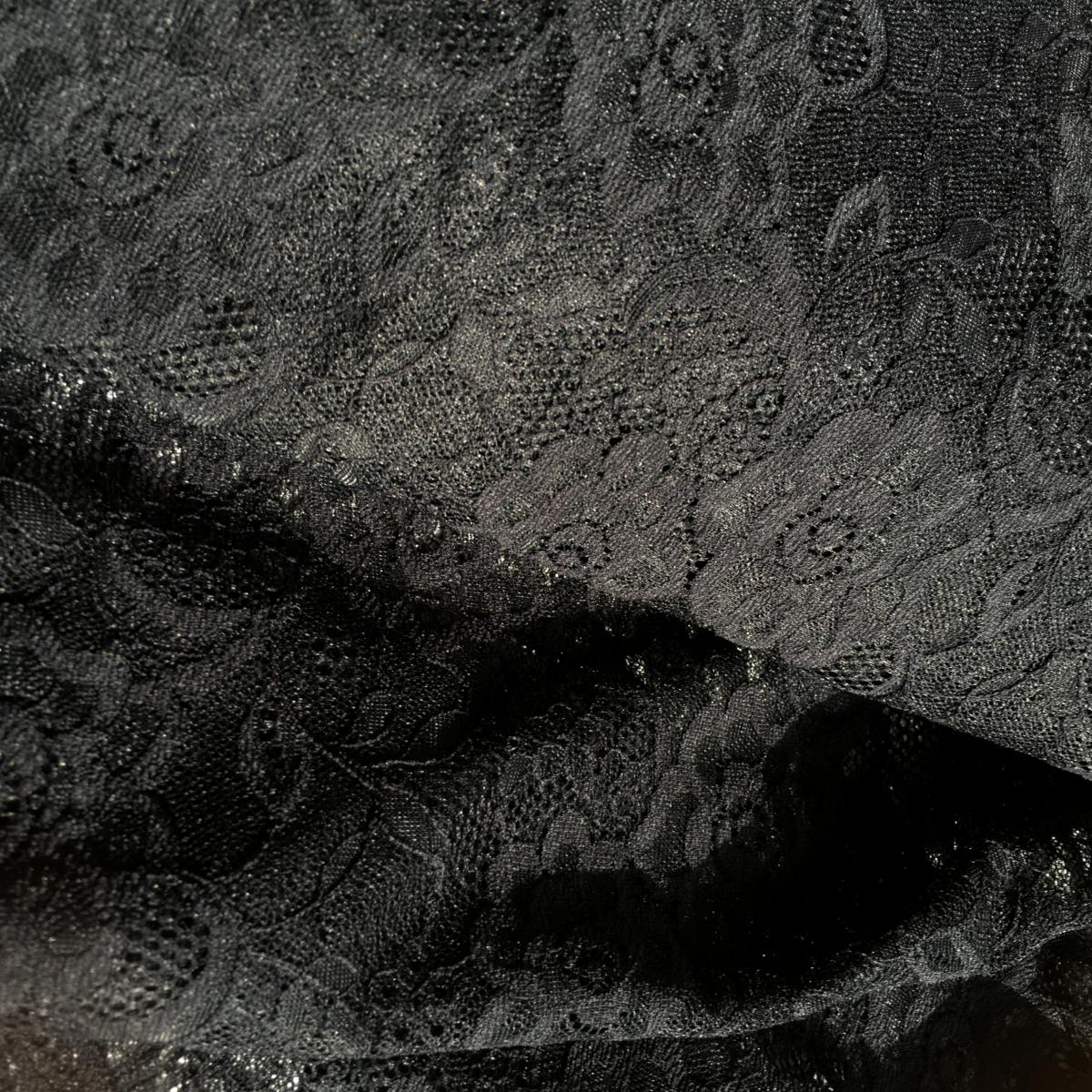 Dentelle en 100 % nylon, en 150 cm de large, vendue par 25 cm x 150 cm. Elle est très bien finie, souple et douce au toucher. Elle peut être utilisée pour poser par dessus une robe en jersey par exemple.