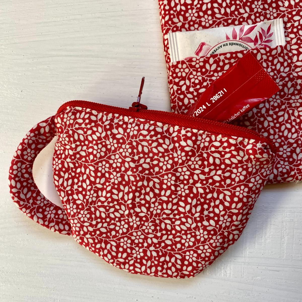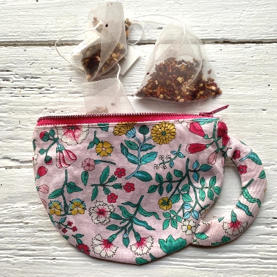 - Une trousse en forme de tasse fermée par une fermeture éclair, pour les thés en sachets de mousseline.
