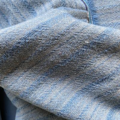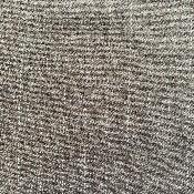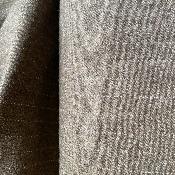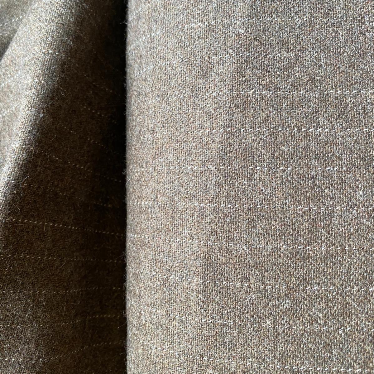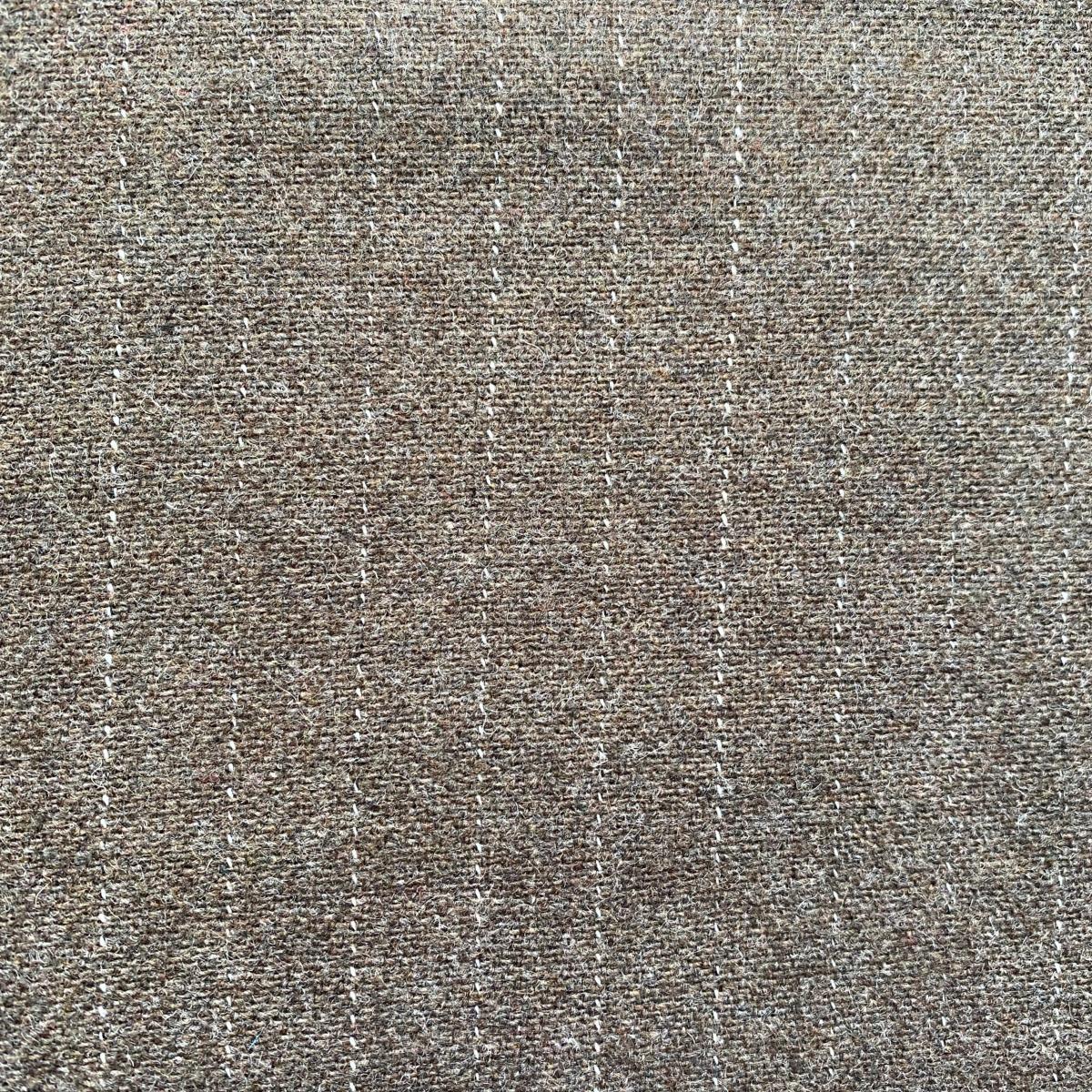 Fines rayures blanches en pointillé sur fond marron. On a l'impression sur les photos que la couleur tire sur le gris mais en vrai, c'est un marron (on s'en aperçoit en le mettant à côté d'un tissu gris tant la nuance est faible)