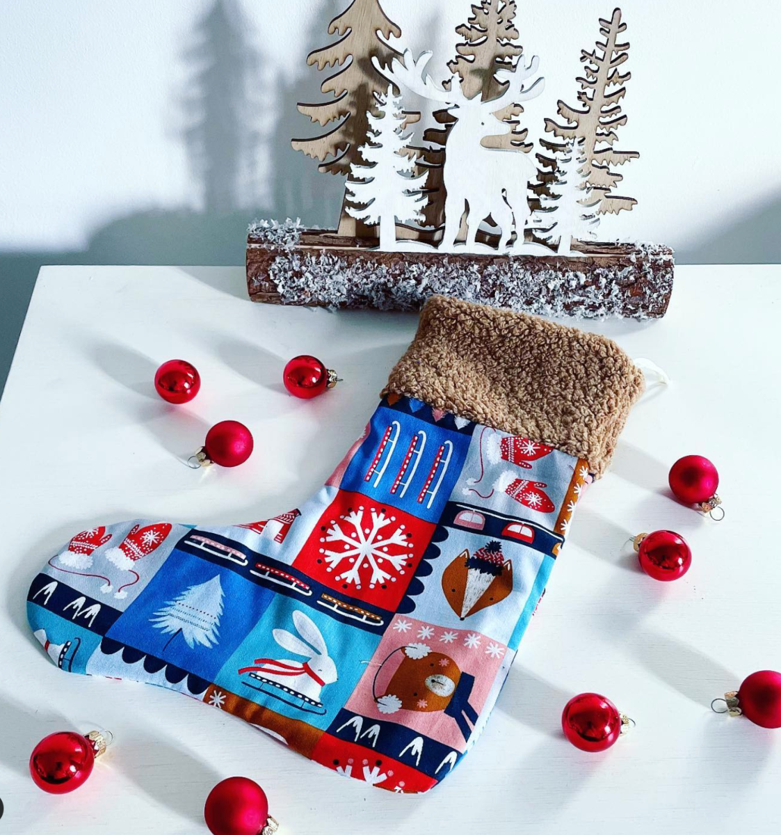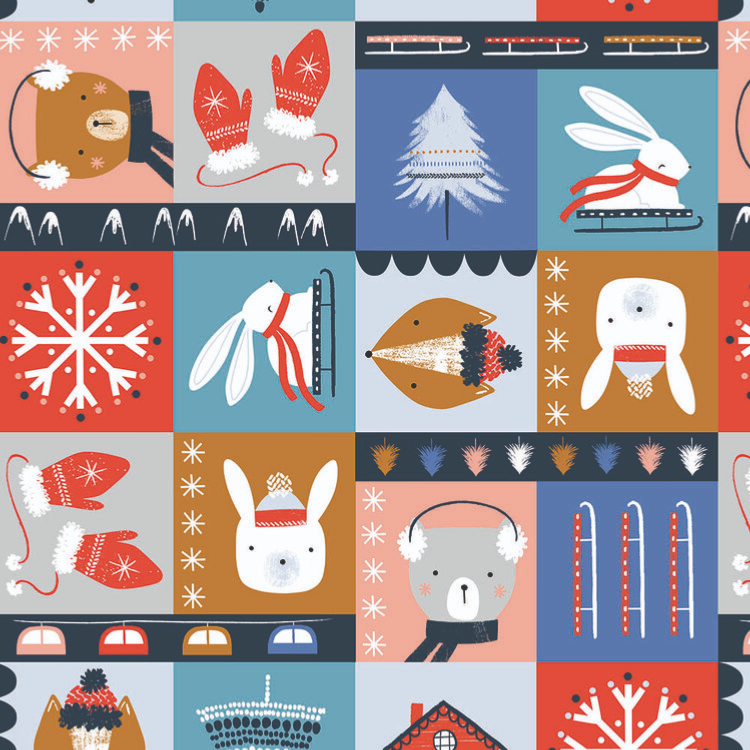 In a crisp palette of icy blues with pops of bright red, Snow Much Fun tells the story of some daredevil animals enjoying a skiing adventure in the Alps, wrapped up warm, racing downhill and riding the cable cars. Now it must be time for some Après Ski.
