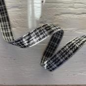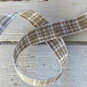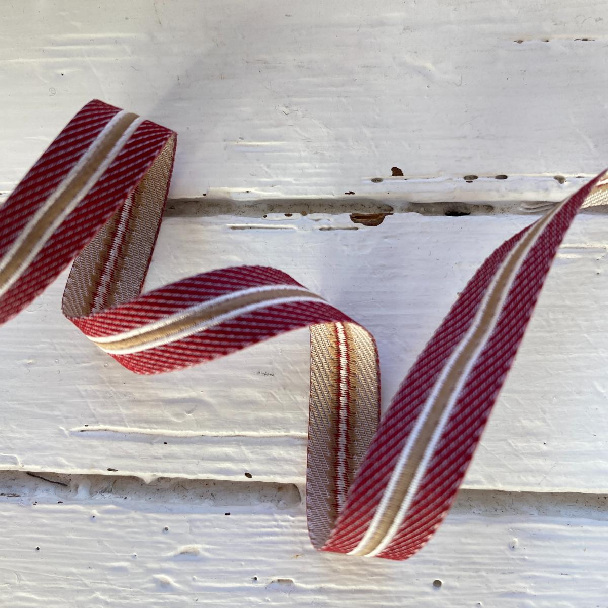 Sergé polyester d'un centimètre de large. Rayures beige et blanc cassé sur fond bordeaux