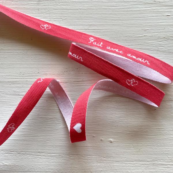 Ruban d'un centimètre de large, avec l'inscription "fait avec amour" en blanc sur rouge.