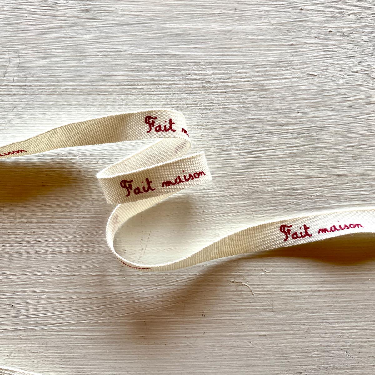 Ruban d'un centimètre de large, avec l'inscription "fait main" en rouge sur fond blanc cassé.