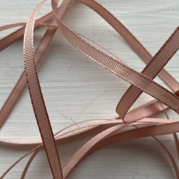 Vendu par échevette de 3m. Ce ruban est magnifique. Difficile de décrire sa couleur, sorte de beige, légèrement brillant. Il est plus "raide" que les rubans classiques, il peut apporter une touche de lumière à un bouquet de fleurs par exemple.