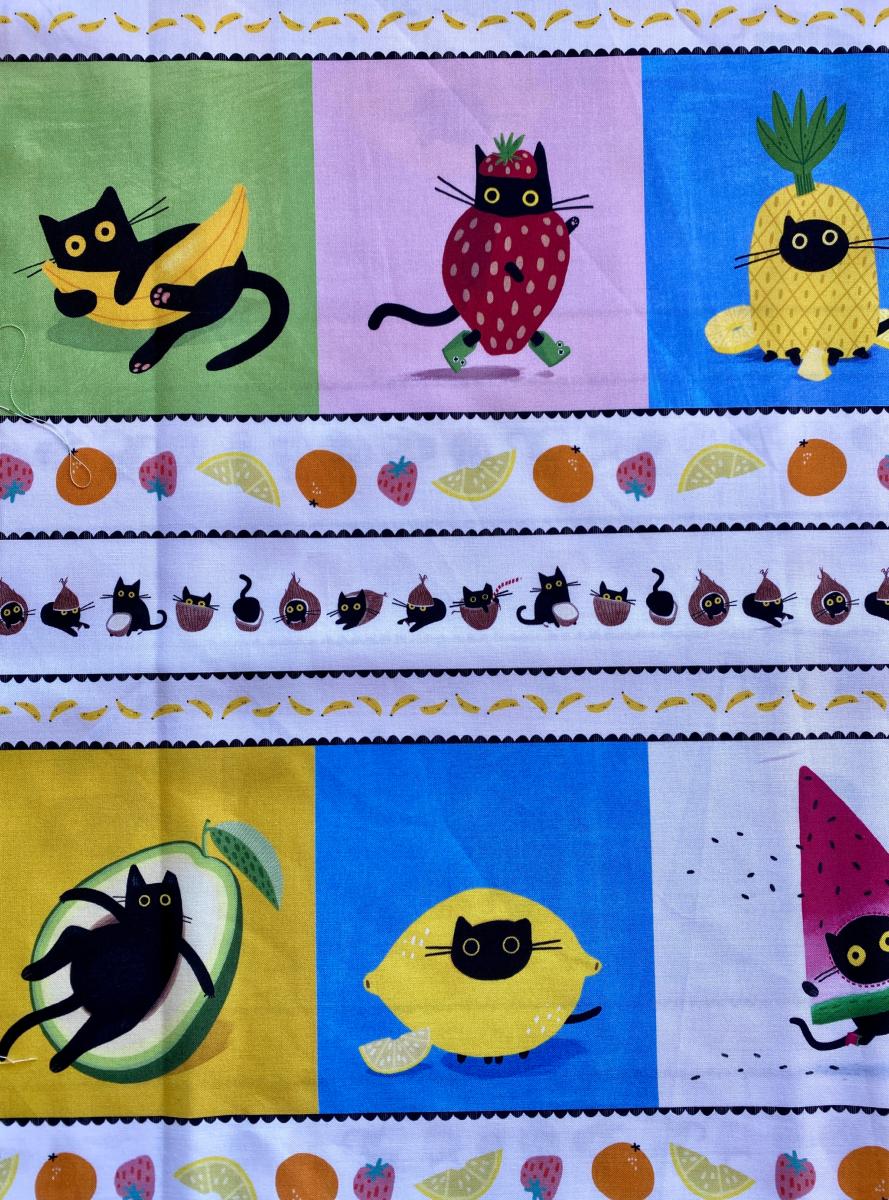 Adorable imprimé avec des chats et fruits ! Ce tissu conviendra pour la confection de trousses, sacs, trousses, pochons, coussins, rideaux ..