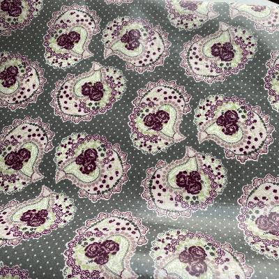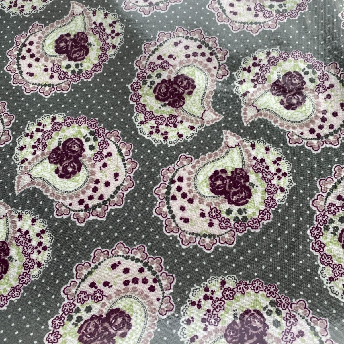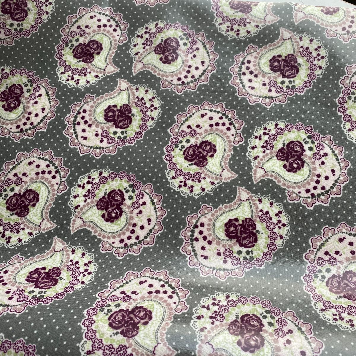 Superbes motifs dans des tons de parme, sur un fond qui rappelle les rayures d'une toile à matelas