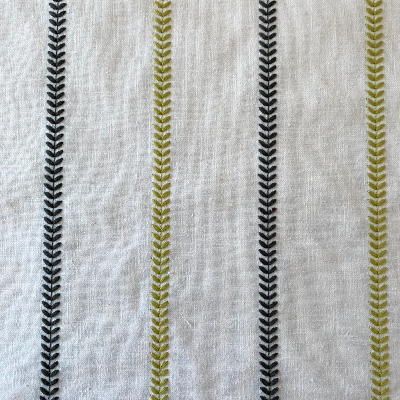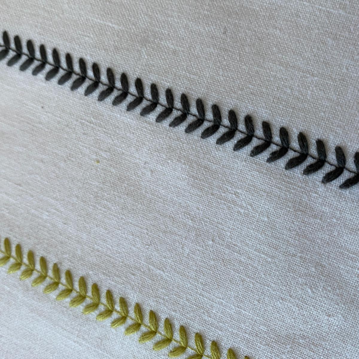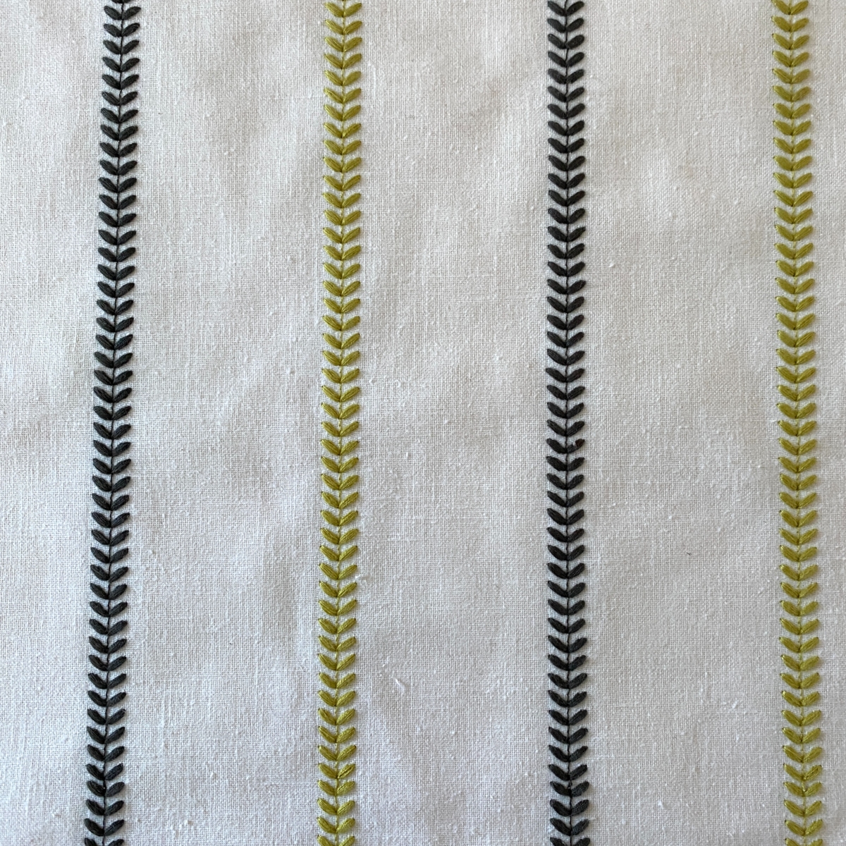 Il est de toute beauté, les rayures grises et moutarde sont brodées de motifs en forme de feuillages.