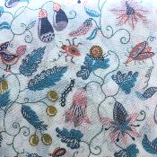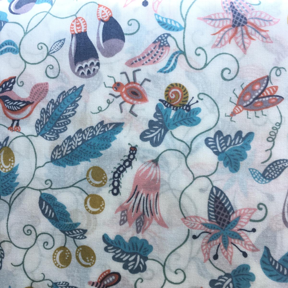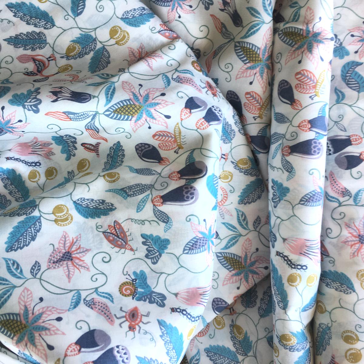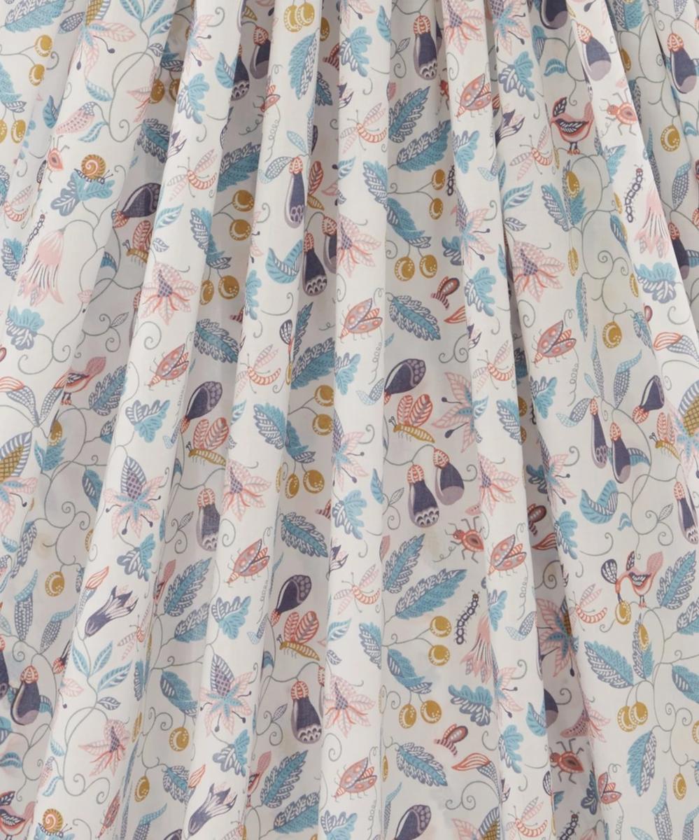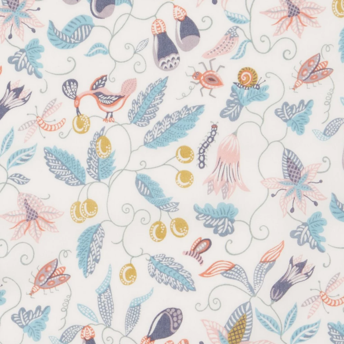Jitter Bug est un jardin à la flore fantastique - des fruits succulents poussent à partir de vignes traînantes, où les oiseaux voltigent et les insectes rampent. Cet imprimé décalé a été redessiné à partir d'un design Liberty créé à l'origine en 1990.