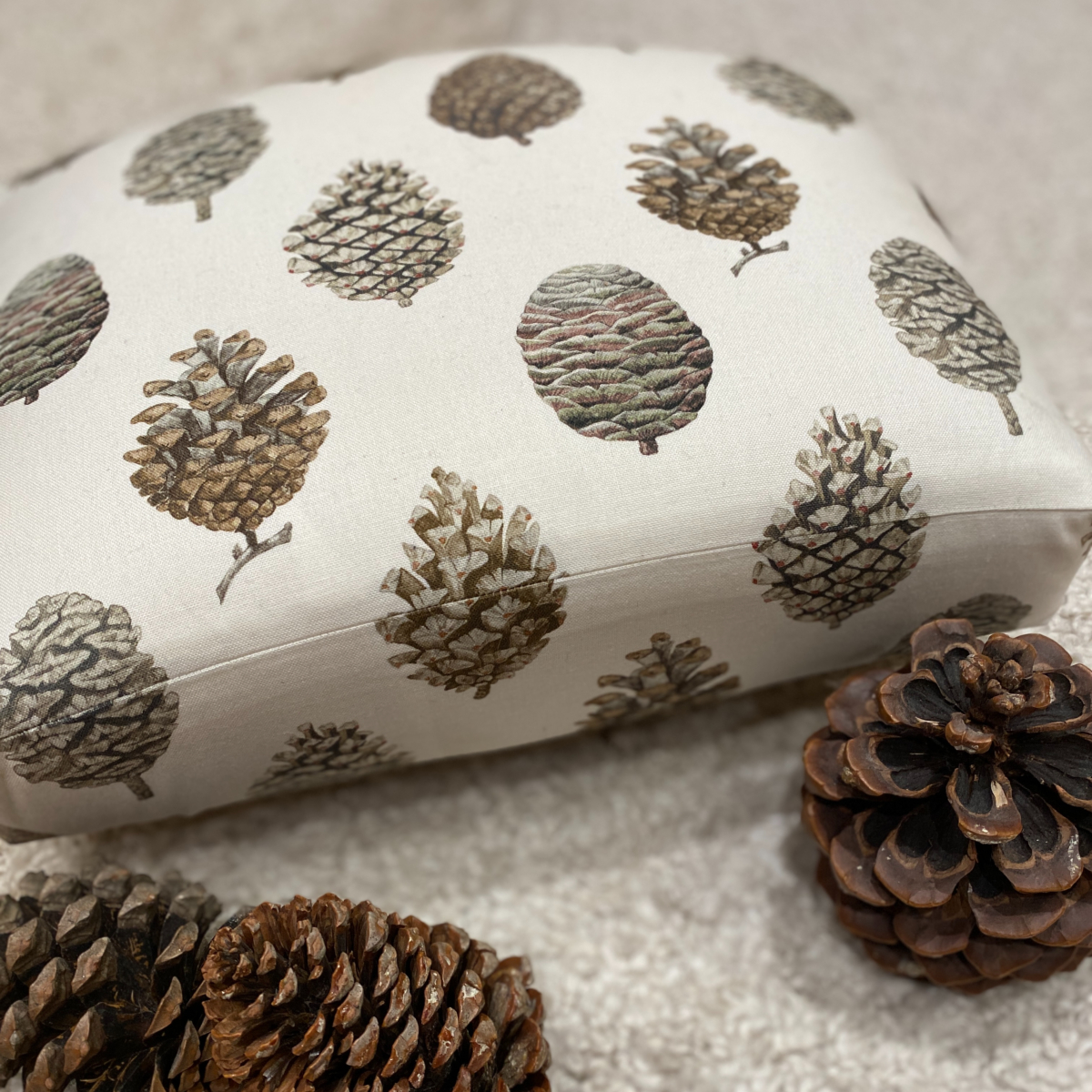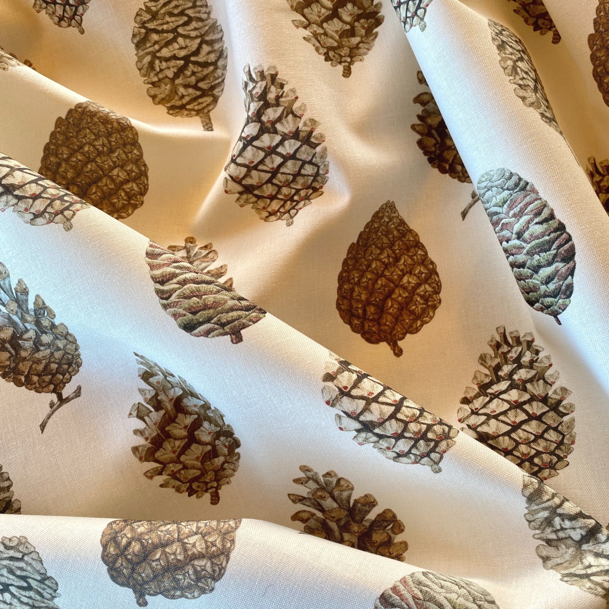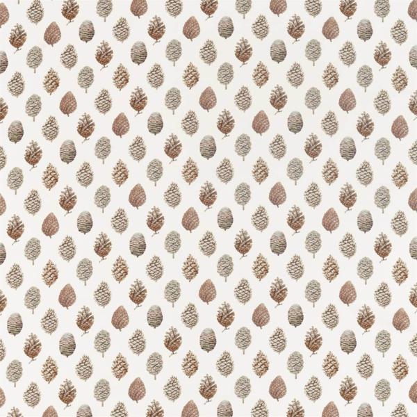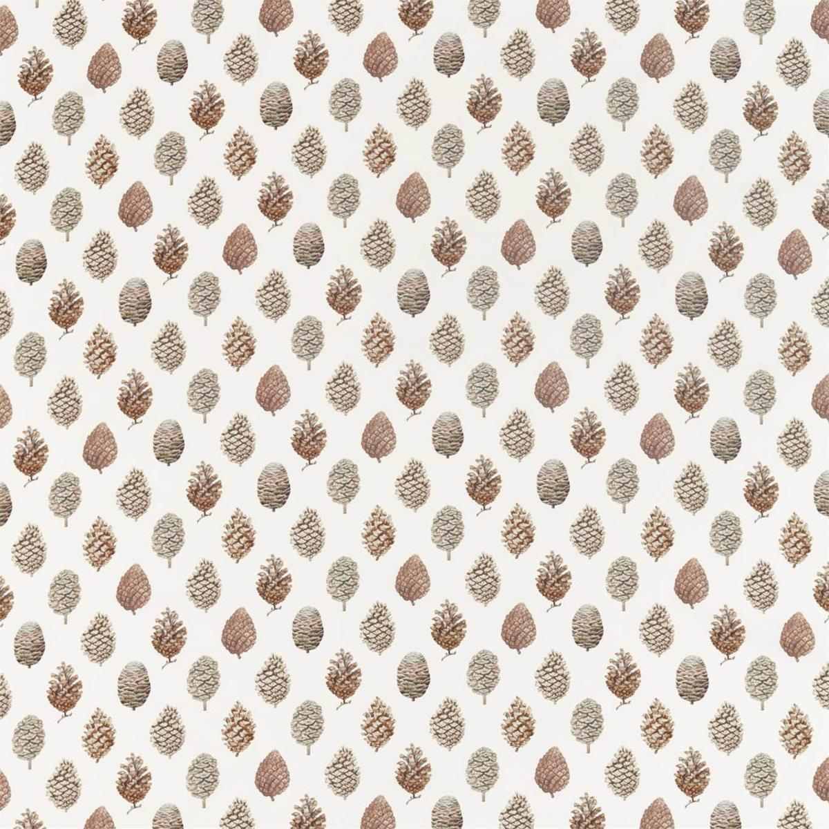 Un florilège de pommes de pins ouvertes ou fermées a été peint à la main et imprimé sur un tissu en coton pour créer un motif parfait de taille moyenne, idéal pour les rideaux et tissus d'ameublement des maisons de campagne.