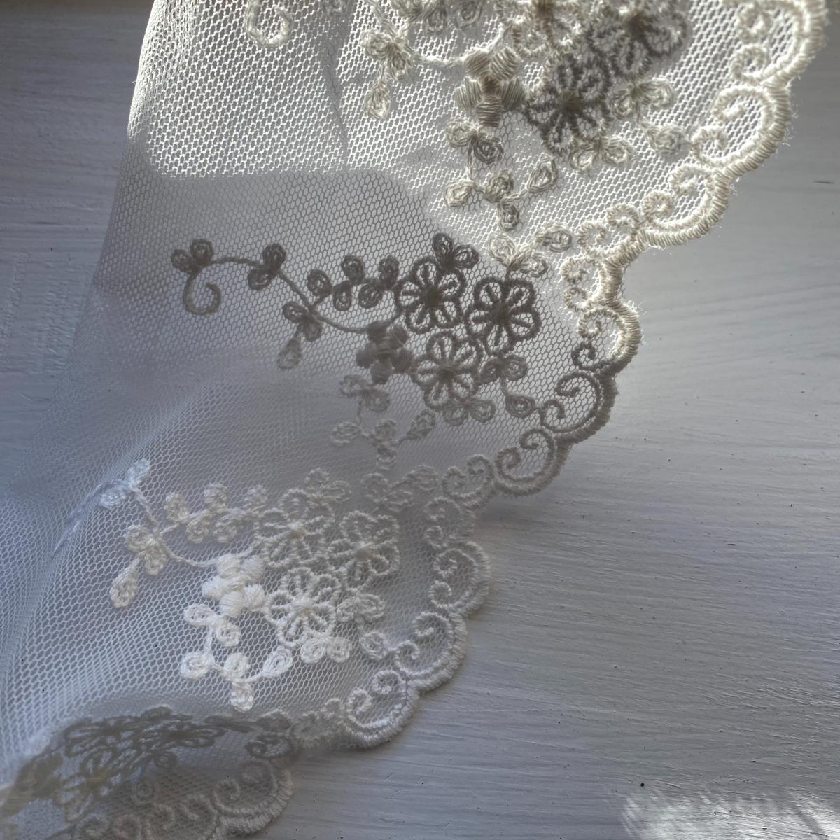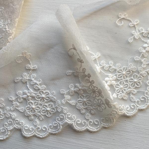 Tulle dentelle très large (12 cm), prix indiqué pour un mètre. La couleur noire parait claire sur la photo mais en réalité, c'est un noir profond.
