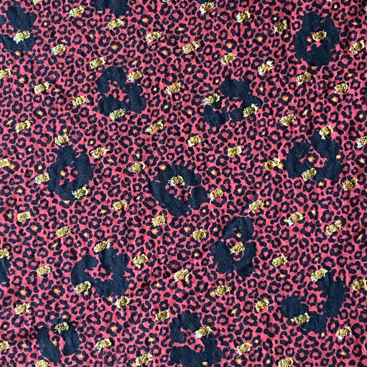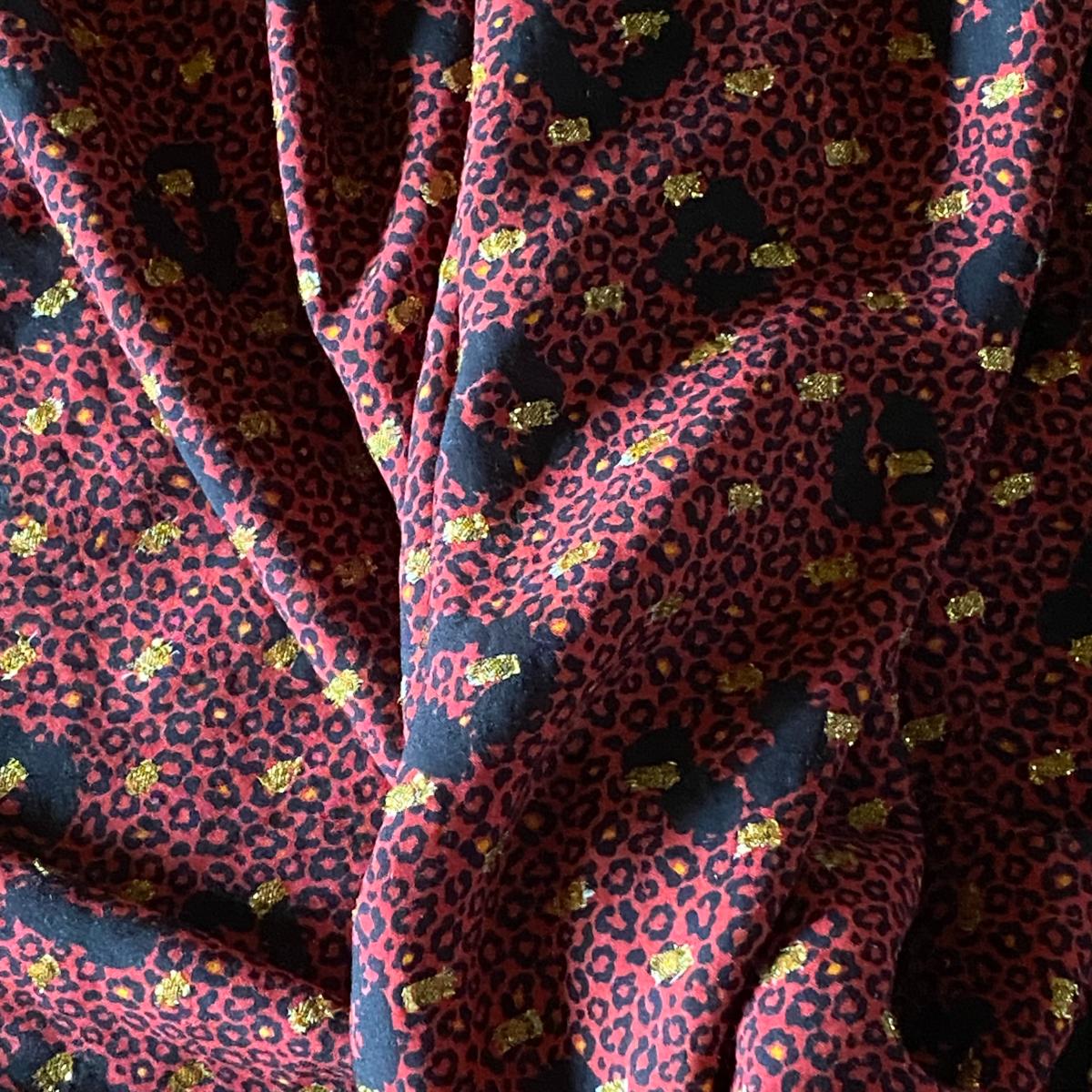 Le fond rouge est plus chaud en réalité que sur la photo. Cette viscose est incrustée de petites touches de lurex !